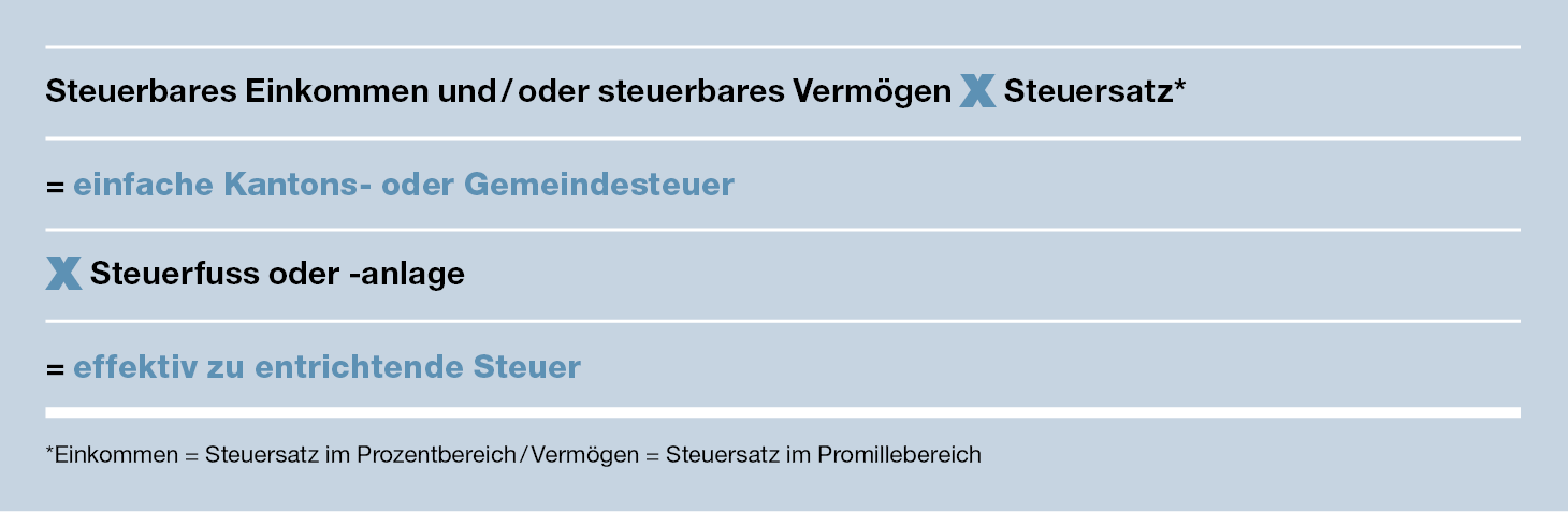 - Einfache Steuer mal Steueranlage des Kantons ergibt die Kantonssteuer. Sie gilt für das ganze Gebiet des Kantons.