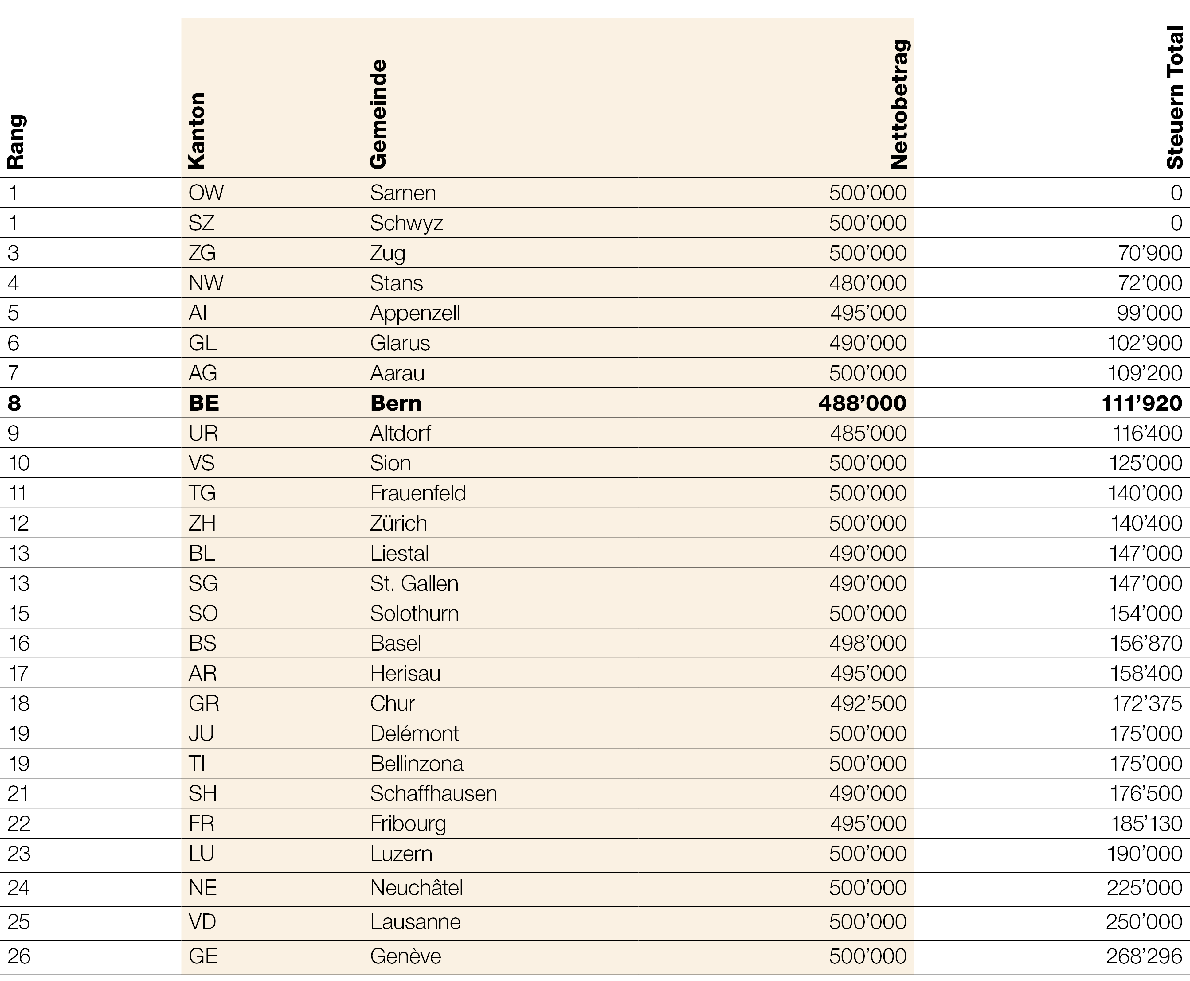 | Steuerbares Kapital | Steuerbelastung in % 2024 | Steuerbetrag 2024 | Steuerbetrag 2017 | Δ Steuer-betrag 2024 zu 2017 | Rang BE 2024 | Rang BE 2017 | Δ Rang 2024 zu 2017 |