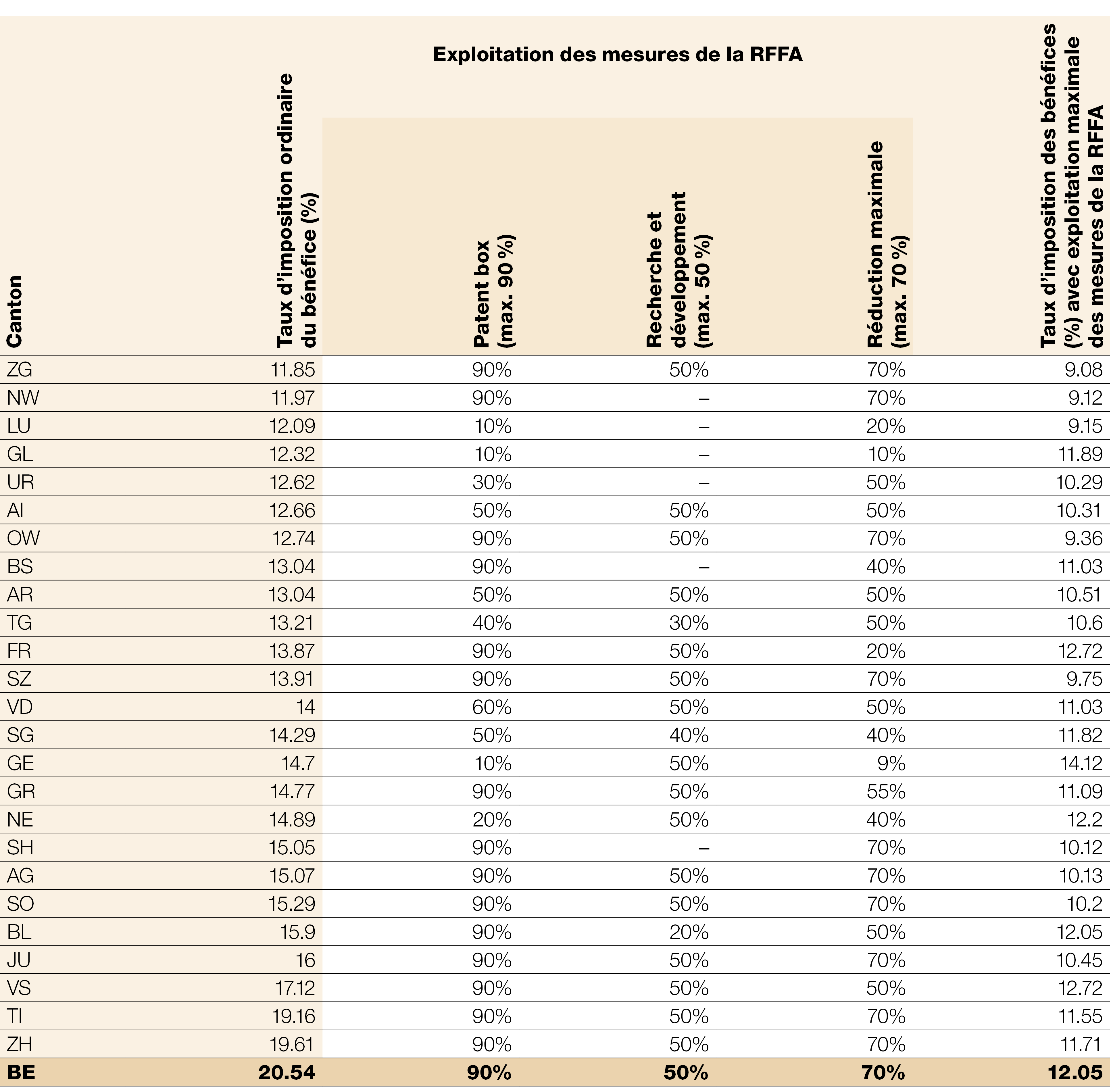 En outre, elle présente sous les mesures d’allégement de la RFFA instaurées par les cantons et les taux d’imposition (réduits) sur les bénéfices qui en découlent, dont bénéficient les entreprises profitant pleinement des nouveaux dispositifs.